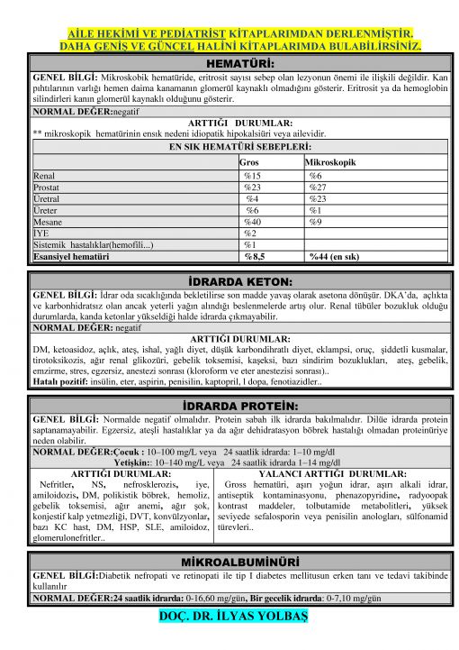 İDRAR PARAMETRELERİ REFERANS DEĞERLERİ
